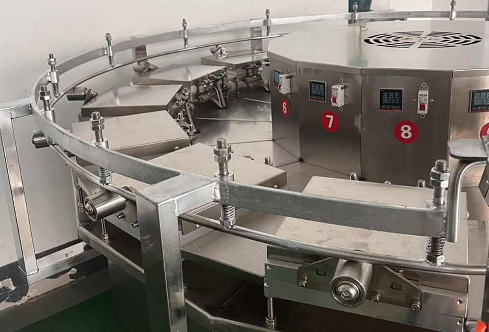设备型号15模8片机,设备有15个烤盘,每个烤盘上可以产出8片产品,产品尺寸9-9.5cm,具体可以根据自己产品需求进行设置。